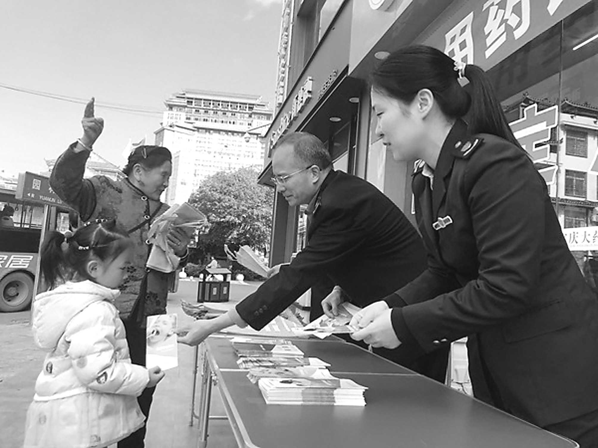 □十一月十九日,广西壮族自治区融水苗族自治县市场监管局结合“不忘初心、牢记使命”主题教育,在辖区开展“全国安全用药月”科普宣传活动,通过悬挂条幅、发放宣传资料等方式,向群众宣传《药品管理法》《疫苗管理法》,普及安全用药知识。□潘雪芳 韦文平/摄影报道