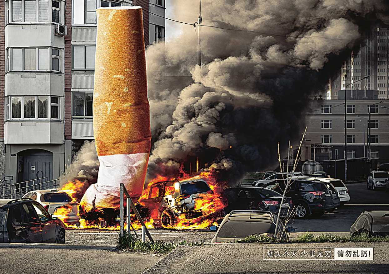 赏 析:此组作品放大了火灾现场的火柴和烟头,通过把隐患凸显出来的形式,告诫大众切勿乱扔火种,否则火患无穷。